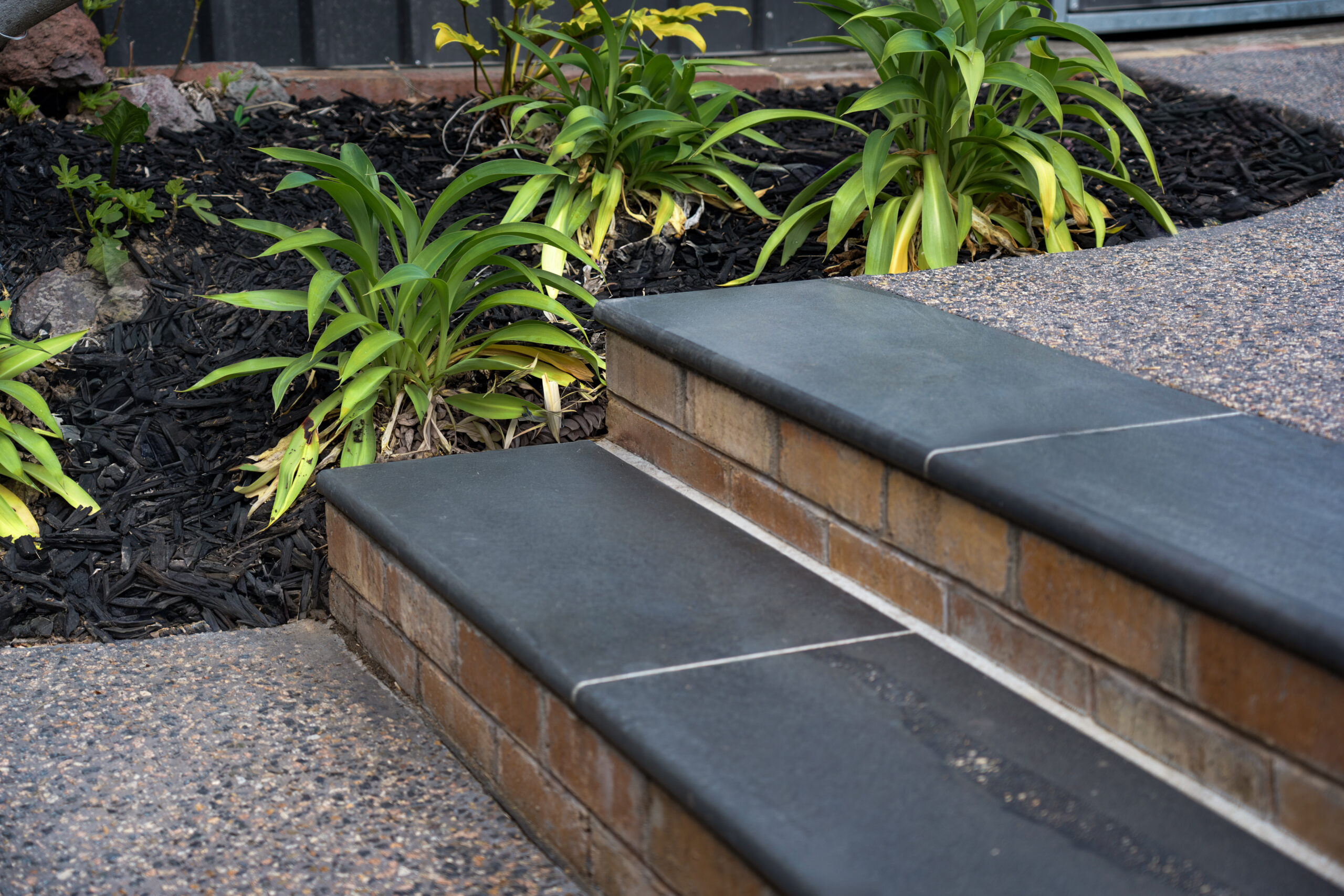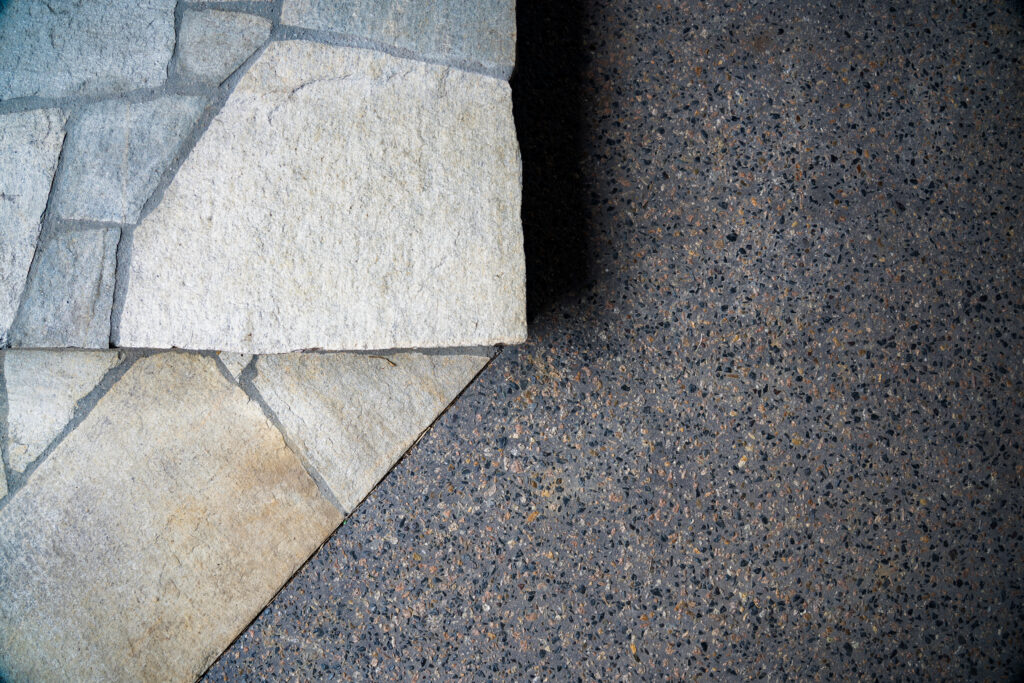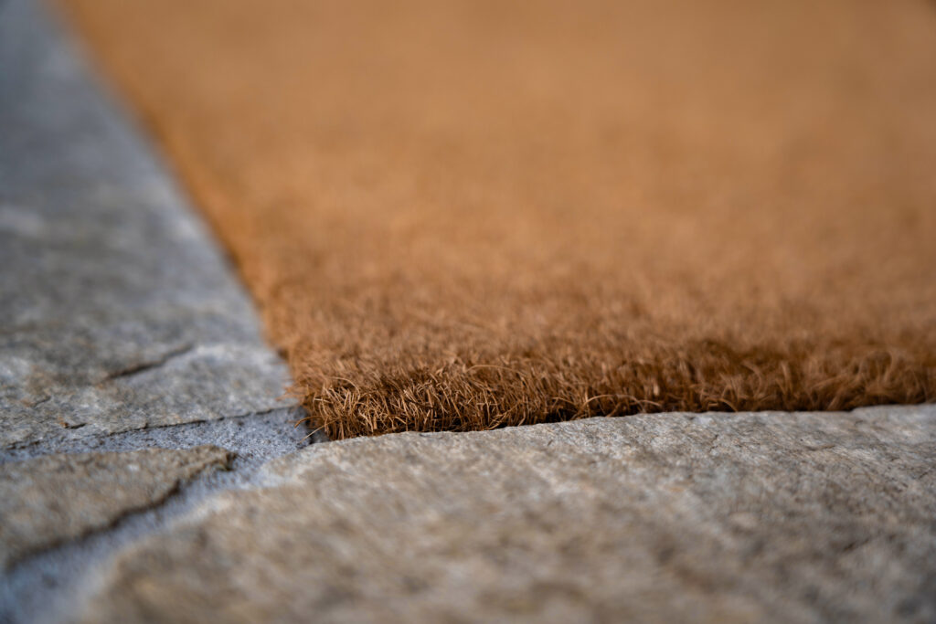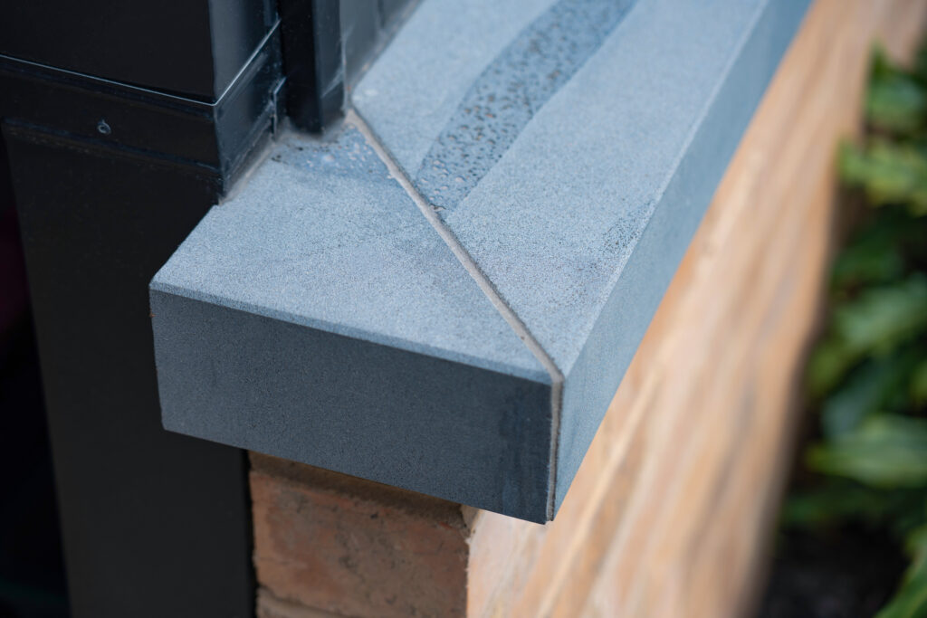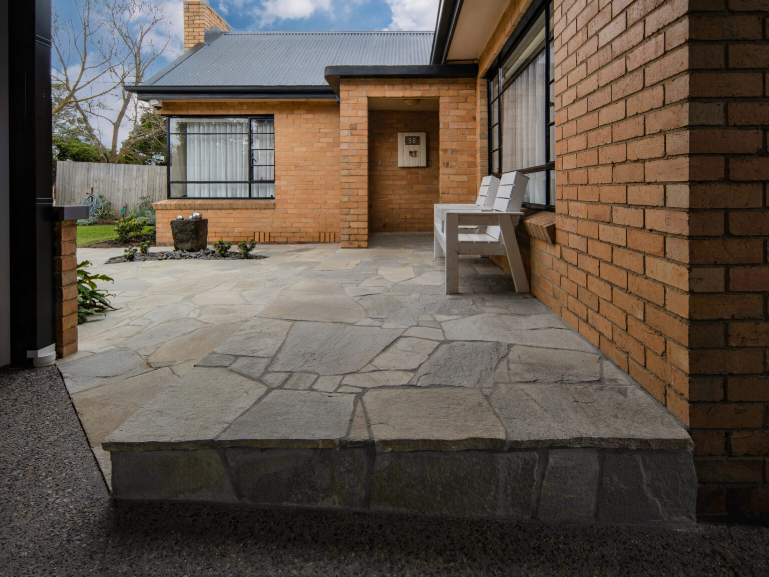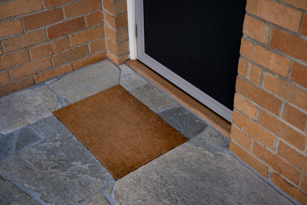 The entry sequence is being rebuilt with a stronger sense of texture and movement, using ‘Endicott’ crazy paving to create a natural, organic pathway that feels timeless underfoot. The irregular stone shapes and split-stone finish deliver a relaxed, premium character, allowing the paving to sit beautifully alongside softer garden edges and flowing planting curves. A recessed outdoor coir mat has also been integrated at the front door, adding a practical detail that helps keep the entry cleaner and looking sharp every day.