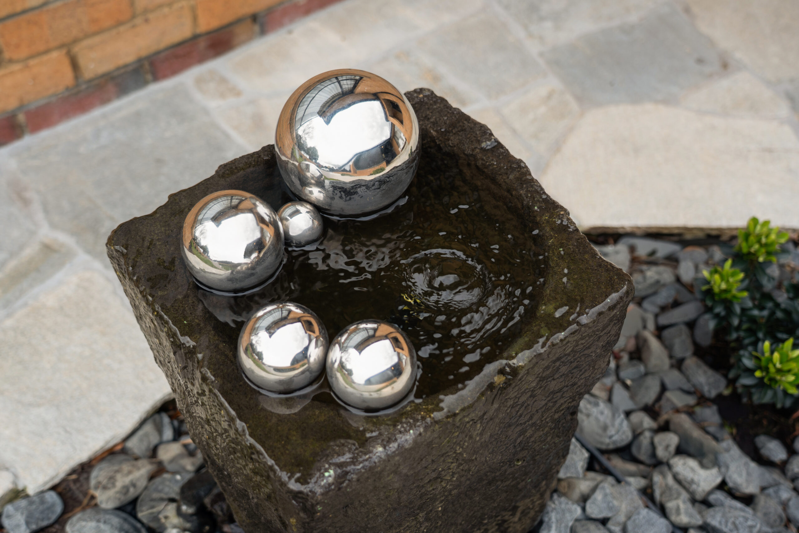 This sculptural water feature adds a refined focal point to the front garden, bringing gentle movement and atmosphere to the entry. A repurposed 100-year-old solid stone mortar introduces history and timeless character, while the circulating water creates a soft surface ripple that keeps the space feeling calm and alive. Polished stainless-steel spheres catch the light and reflect the surrounding architecture and greenery, creating a subtle luxury detail as you arrive.