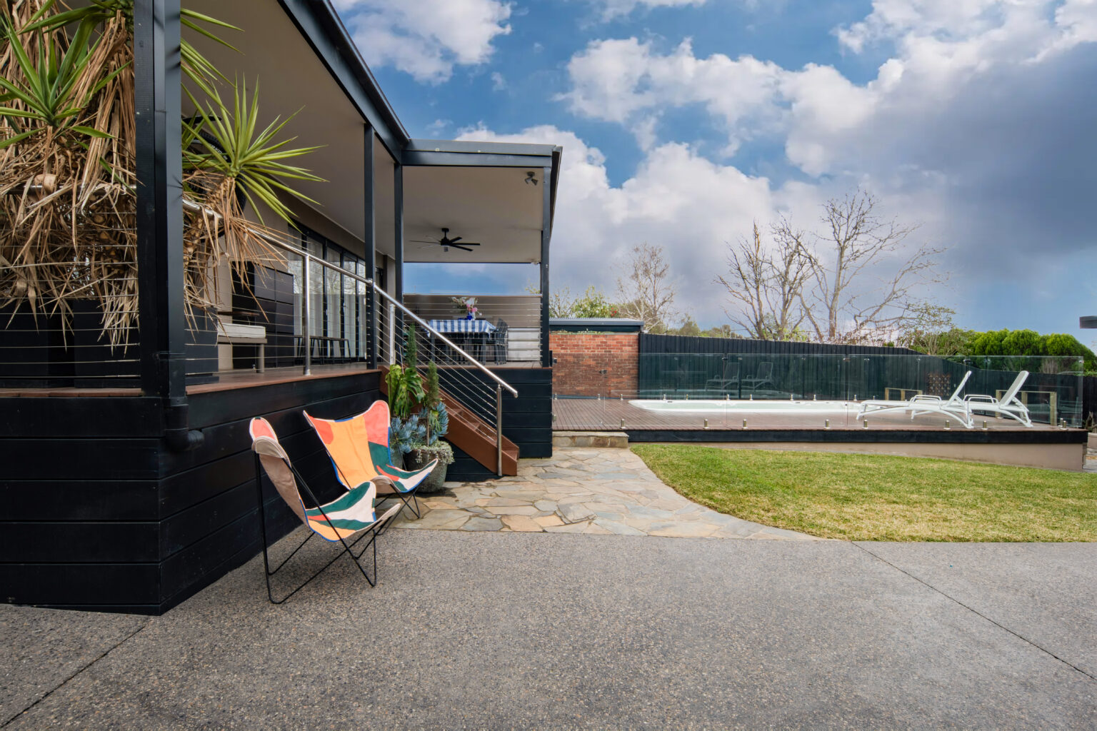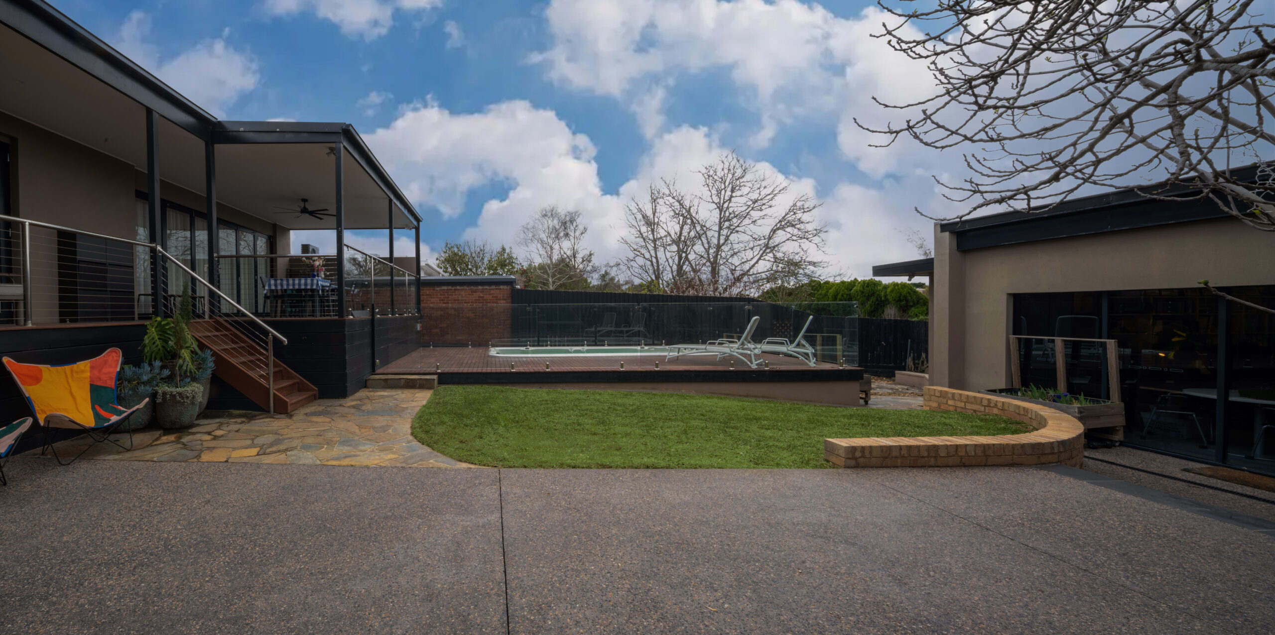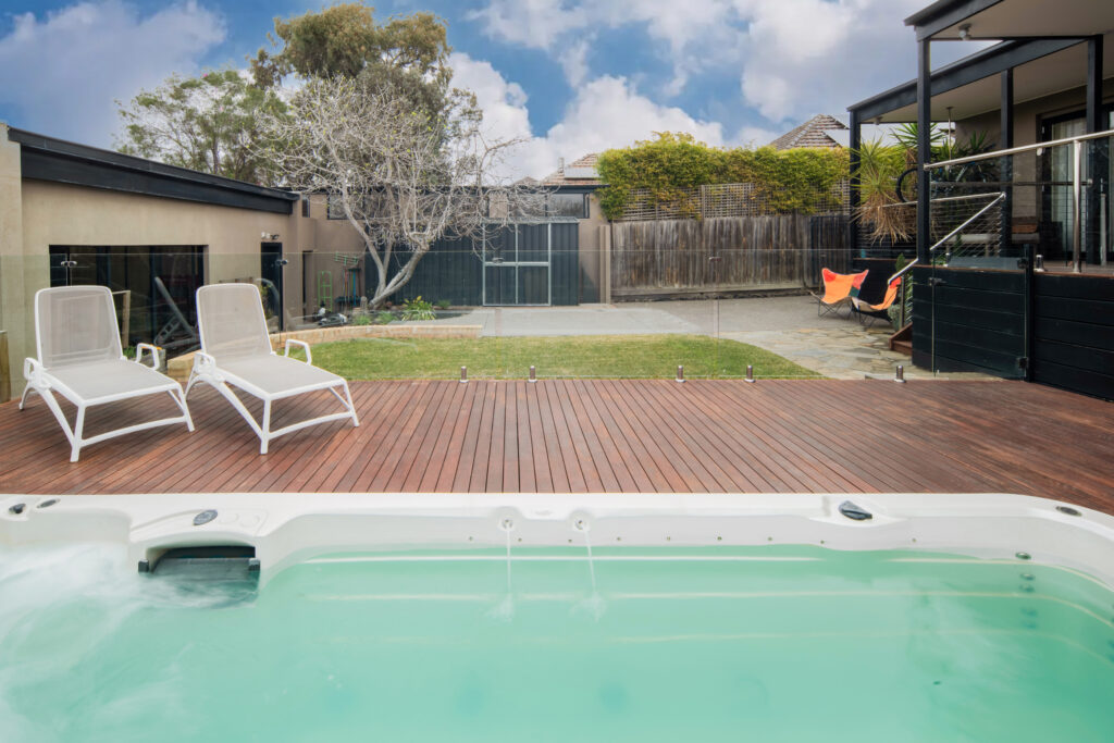 The backyard is centred around a 6.0 x 2.3m Swim Spa and a generous timber deck, creating a relaxed resort-style space for everyday living. The pool safety glass fencing keeps the area open and visually connected to the garden, while sun loungers on the deck make it an easy spot to unwind.