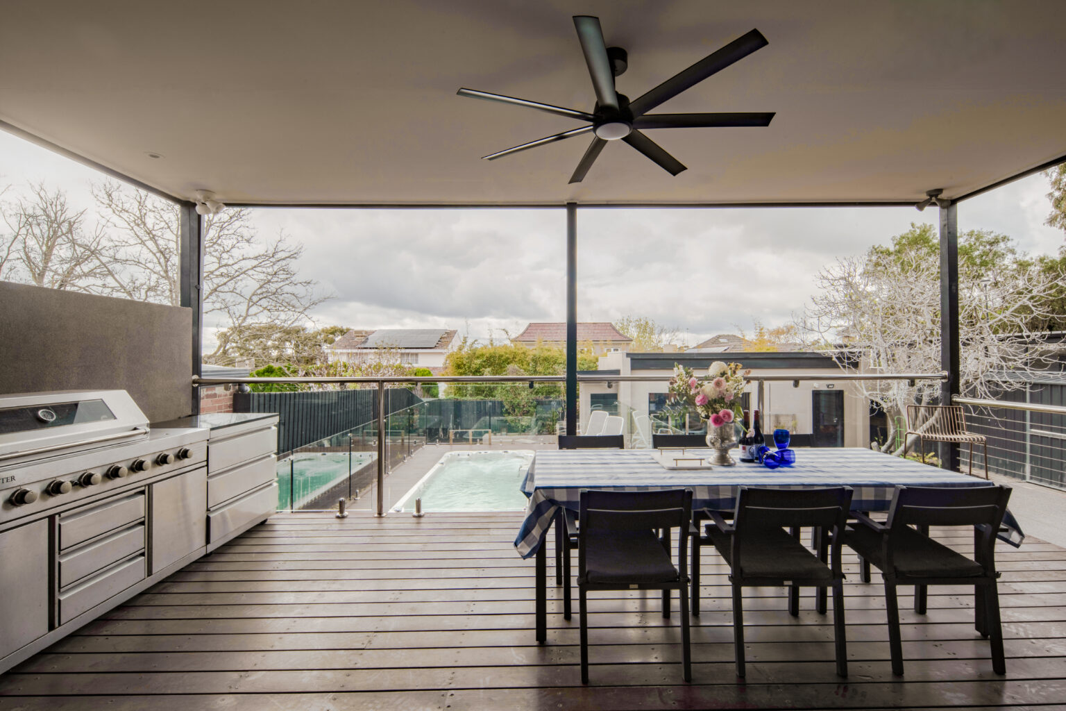 The elevated entertainment deck is the home’s main outdoor living hub, designed for comfortable hosting year-round. A ceiling fan keeps the space cool, while the built-in BBQ and outdoor kitchen make outdoor dining effortless. With a large seating and dining area overlooking the backyard and Swim Spa, it creates a seamless connection between relaxing and entertaining.